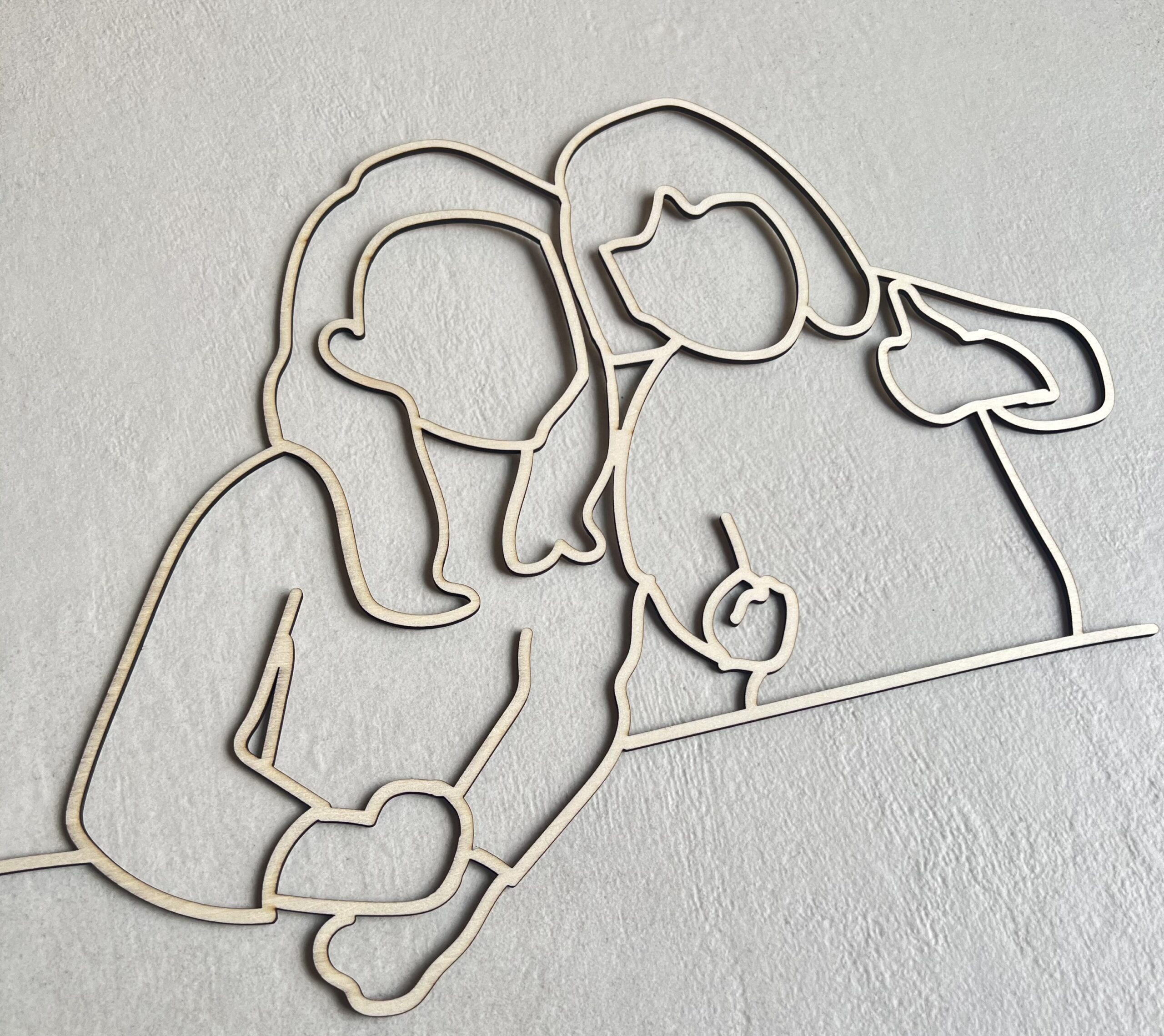 Auf der Suche nach einer einzigartigen und persönlichen Wanddekoration? Mit unserem Holz-Linienporträt erwecken wir dein Lieblingsfoto in einer eleganten, aus Holz geschnittenen Linienzeichnung zum Leben.